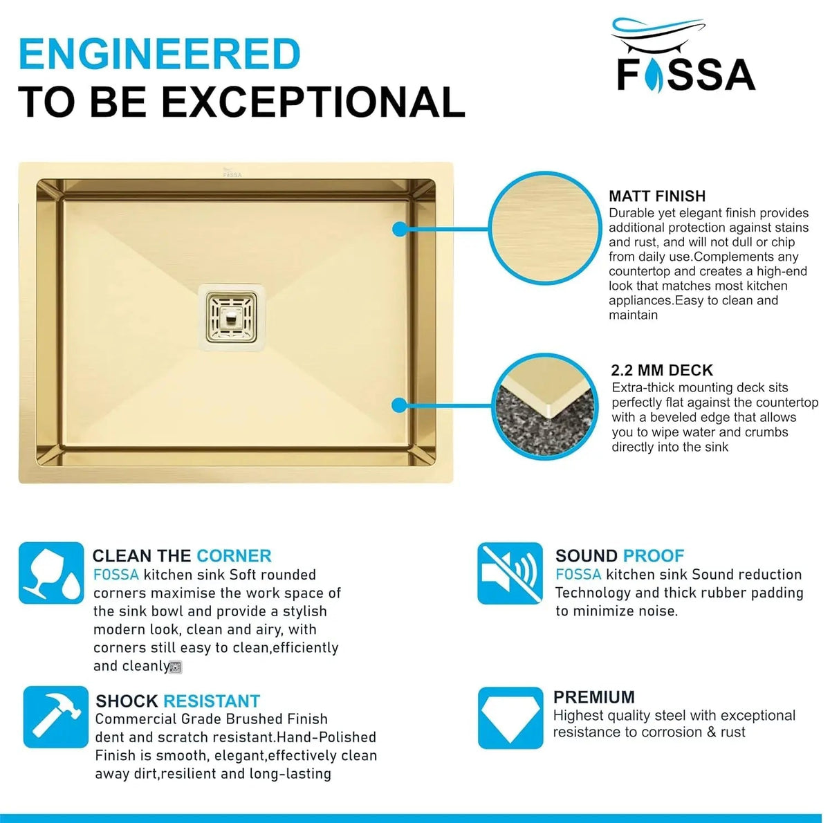 - The finish of the Fossa Brushed Matte finish that adds a contemporary aesthetic to your kitchen décor and the smooth non-porous finish resists water spots, stains, and scratches, keeping your sink looking as beautiful as the day it was installed.